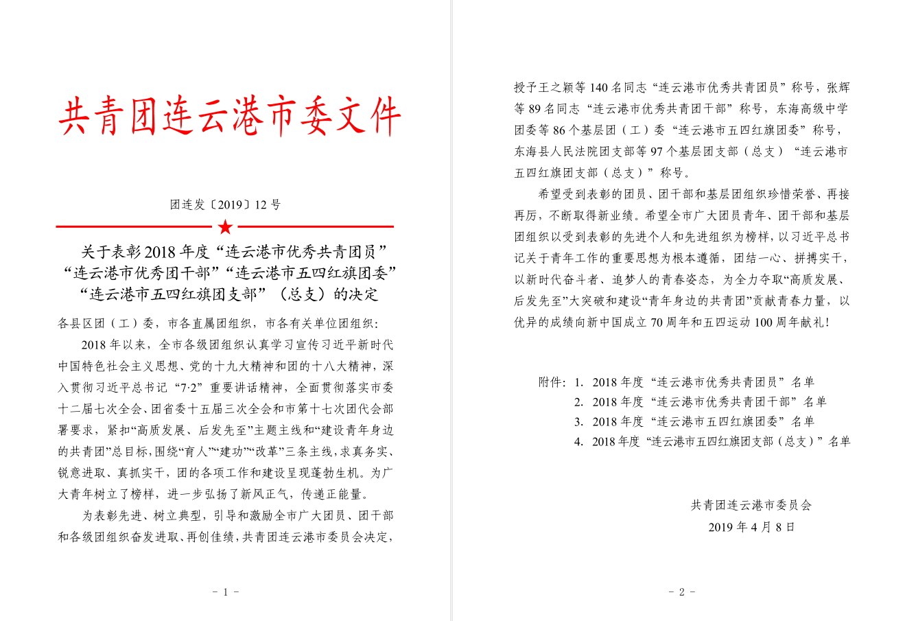 近日,共青團(tuán)連云港市委員會公布了2018年度“連云港市優(yōu)秀共青團(tuán)員”“連云港市優(yōu)秀團(tuán)干部”“連云港市五四紅旗團(tuán)委”“連云港市五四紅旗團(tuán)支部”(總支)名單,我公司員工李筠涵榜上有名,被授予“連云港市優(yōu)秀共青團(tuán)員”稱號。
