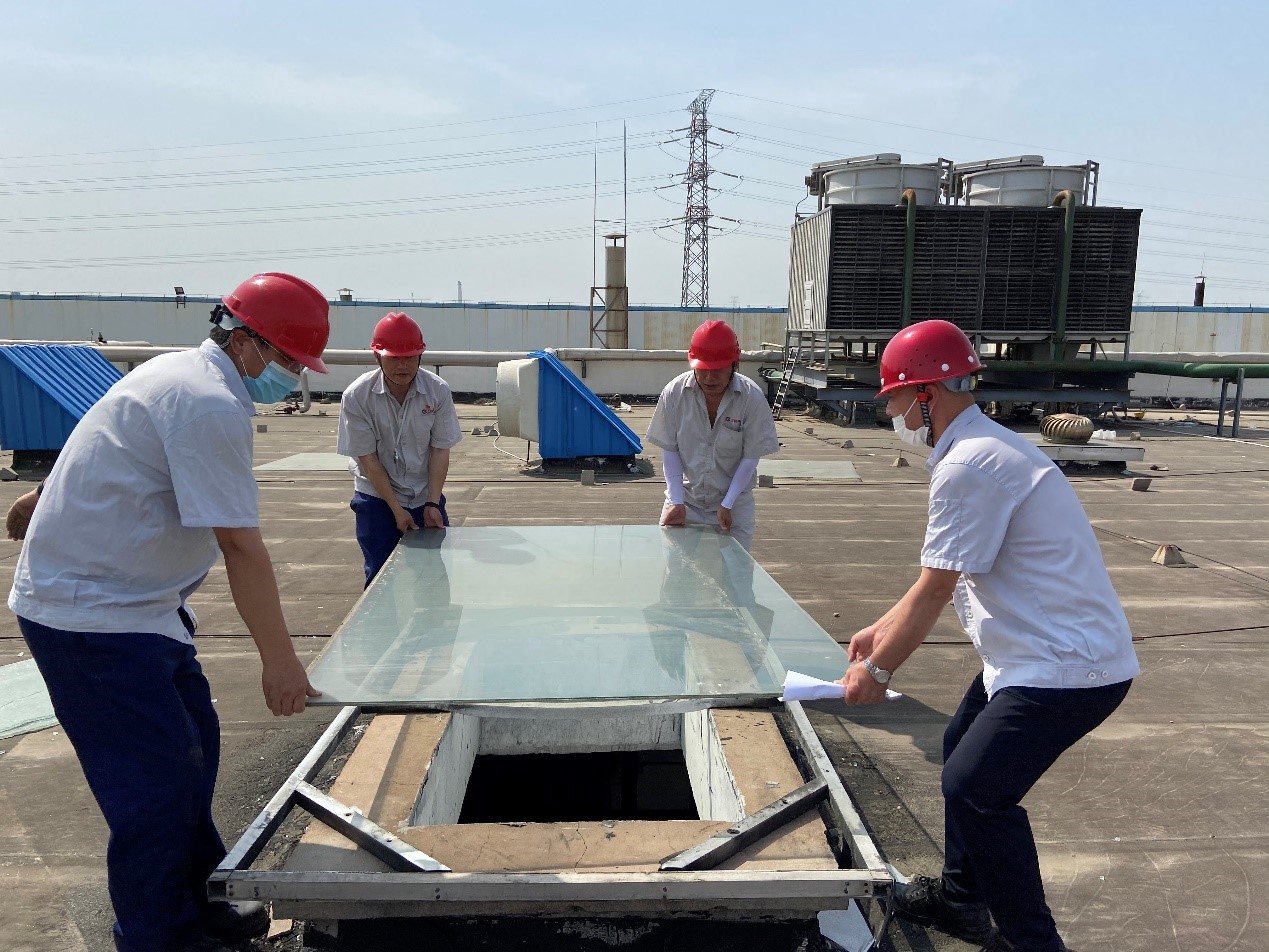 檢查過(guò)程中,總經(jīng)理韓立新發(fā)現(xiàn)部分天窗玻璃蓋板有破損,當(dāng)機(jī)立斷,頂著炎炎烈日,率先搬起備用玻璃蓋板,動(dòng)員安委會(huì)成員一起更換天窗玻璃蓋板,及時(shí)消除安全隱患,筑牢安全防線。艷陽(yáng)下?tīng)C手的玻璃,燙著韓總等安委會(huì)成員的手,但溫暖著一線員工的心,切實(shí)感受到公司對(duì)員工生命安全重視。