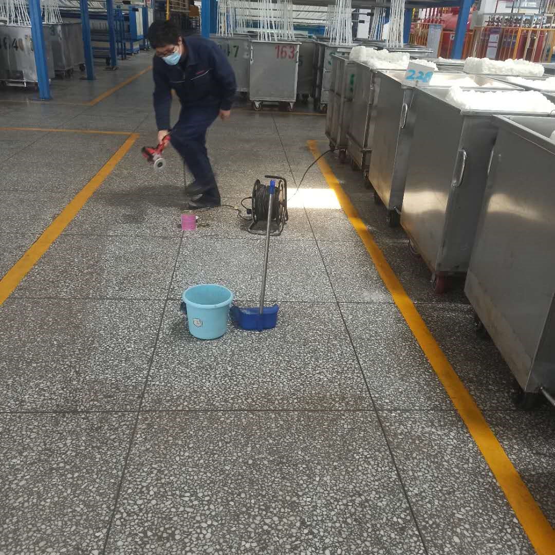 為解決生產(chǎn)車(chē)間地表面磨損嚴(yán)重及地表面黑化等問(wèn)題,4月18日中午,生產(chǎn)車(chē)間甲班大班長(zhǎng)黨曉峰使用手持式打磨機(jī),對(duì)生產(chǎn)車(chē)間后紡集束空地小塊區(qū)域,進(jìn)行了打磨加石板蠟拋光實(shí)驗(yàn)。若實(shí)驗(yàn)效果良好,可進(jìn)行全車(chē)間使用,改善地面油漬黑化現(xiàn)狀,美化生產(chǎn)環(huán)境。