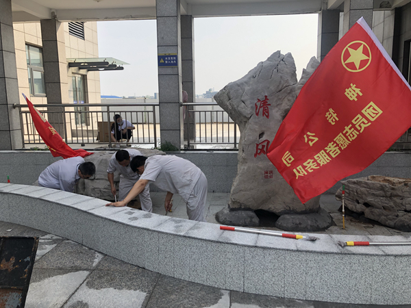 炎熱的天氣下,志愿者們不怕苦,不怕累,奮外賣力的清潔綜合辦公樓東側(cè)的廉政景觀池“清風池”。大家齊心協(xié)力,不到一小時就把“清風池”打掃得煥然一新。