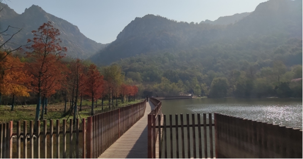 斗轉(zhuǎn)星移,山河已變,五百年前詩人所描述的風(fēng)景我們無法再欣賞到,但是現(xiàn)在的園林水庫更有一番風(fēng)采?;鸺t的水杉是她最引人注目的特色之一,寒風(fēng)掠過,水杉的葉子也逐漸變成了鮮艷的火紅色,猶如一片片燃燒的火焰,在寒冷的季節(jié)中增添了一抹暖色。徜徉于火紅的水杉林,陽光下樹影婆娑,寧靜,安逸,沉醉于詩畫中。波光粼粼的湖水更是一幅美妙的畫卷,清澈透明,水草搖曳,微波蕩漾,游魚穿梭,仿佛寒冷與它們無關(guān)。棧橋嫻熟地穿越著園林與水庫,一直連接到山腳,行走其上,腳下水光瀲滟,眼前層林盡染,晴空之下無一絲塵埃,啾啾鳥鳴,沙沙葉響,嘩嘩水流,大自然的樂章歡快靜謐。