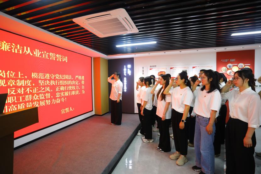 在臺(tái)北(華茂)公司環(huán)保裝備產(chǎn)業(yè)園,參加活動(dòng)人員先后參觀了臺(tái)北黨員自繪的廉潔漫畫(huà)作品、廉潔教育室。隨后,青年黨員代表進(jìn)行了廉潔從業(yè)宣誓,集中觀看了近年來(lái)臺(tái)北(華茂)公司自拍自導(dǎo)自演的優(yōu)秀廉潔文化微視頻、微電影。