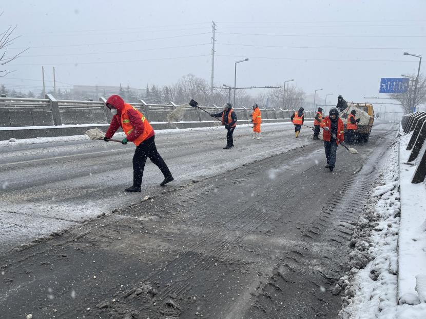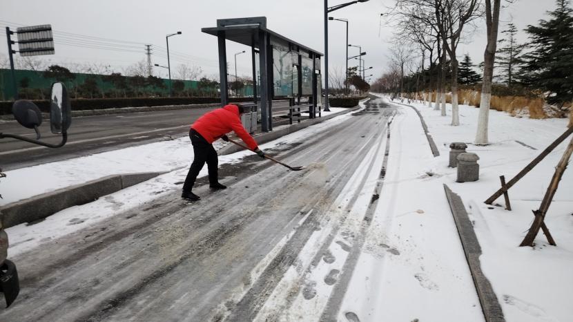 “融雪劑拋灑的時(shí)候要均勻拋灑,不要成團(tuán)堆積,這樣不僅融雪的效果不好,還會(huì)浪費(fèi)物資?!鳖A(yù)備黨員武新忠一邊說(shuō)著,一邊示范著給其他隊(duì)員。哪里的積雪最厚,哪里就有他們揮鍬鏟雪的身影。在融雪劑不能及時(shí)送達(dá)的情況下,他們就使用人工除雪的方式,不斷檔、不離線、不缺位的清除路面積雪,保證路面不出現(xiàn)積雪狀況。為堅(jiān)決完成上級(jí)“雪停路凈”的掃雪除冰任務(wù),他們不畏嚴(yán)寒,冒著風(fēng)雨冰雪,晝夜不停,連續(xù)三天奮戰(zhàn)在掃雪的一線!以雪為令,雪不停,掃雪不止,一直堅(jiān)守在掃雪工作中,有效清除了區(qū)域內(nèi)的積雪,確保了交通道路的安全暢行。