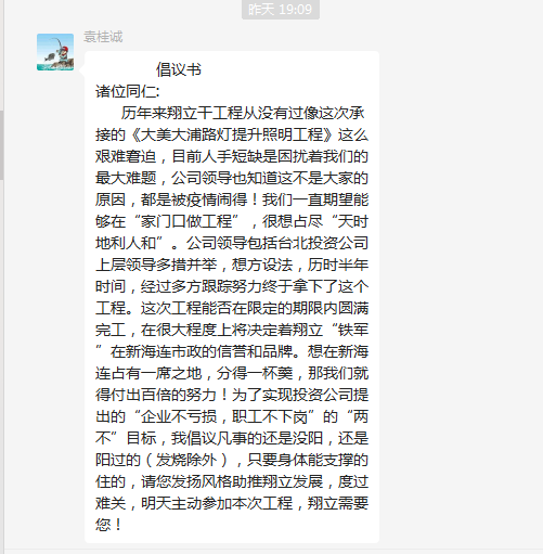 ? ? ? ??運(yùn)籌帷幄,統(tǒng)籌安排。每天早上7點(diǎn)多,都會(huì)看到翔立廠房前的靚麗風(fēng)景線,那是鐵軍們正在進(jìn)行早班會(huì):強(qiáng)調(diào)工作需要注意的安全點(diǎn),進(jìn)行現(xiàn)場(chǎng)分配工作,互相鼓勵(lì)打氣,充分調(diào)動(dòng)大家的積極性;晚上結(jié)束一天勞累的工作,鐵軍們也沒(méi)有閑著,在工作群中熱烈的討論工作情況,大家心往一處想,勁往一處使,彼此間相互鼓勵(lì),努力高質(zhì)量的完成路燈工作。雖然疫情影響減員嚴(yán)重,但是大美大浦亮化工程,7條主干道,翔立已經(jīng)完成了6條,大浦路需要把路燈上的方管變成圓管,才能進(jìn)行更換,翔立分公司未雨綢繆,及時(shí)聯(lián)系廠家送來(lái)配件,確保工程不停工。