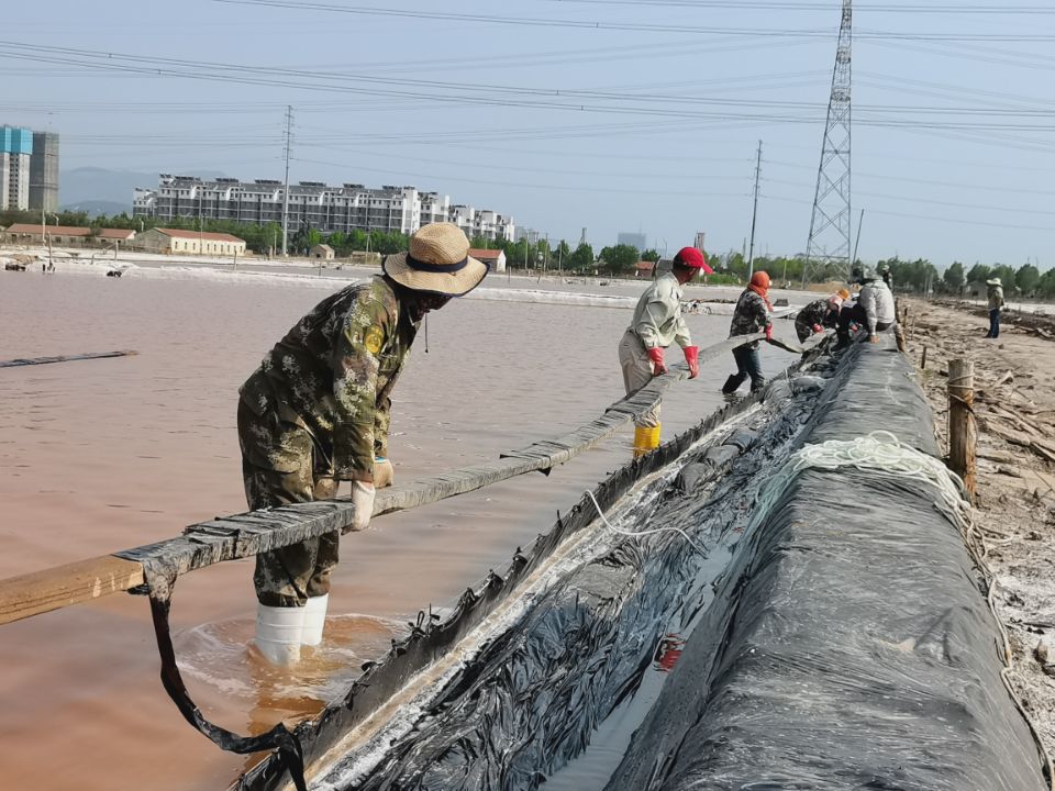 礦鹽生產(chǎn)班組提前謀劃原鹽集運前的準備工作。2022年秋扒鹽已經(jīng)順利落下帷幕,工人們利用收鹽后的空隙對鹽池板進行修整、整理收放系統(tǒng)以及將扒鹽機械進行保養(yǎng)入庫等等。同時,修整運鹽主干道,地基較軟處以鋼板鋪墊,確保運鹽車輛安全通過。排查廩基周圍高低壓線路,在作業(yè)的同時堅守安全生產(chǎn)底線。等待天氣轉好,將立即進行原鹽集運。
