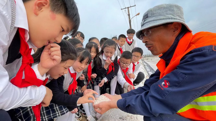 同學(xué)們近距離感受淮鹽的生產(chǎn)過(guò)程,聽(tīng)老鹽工講述過(guò)去收鹽的故事。為了感受鹽工的辛苦,同學(xué)們還興致勃勃地穿上膠鞋,來(lái)到鹽池中,用耙子扒鹽,用鏟子將結(jié)晶的鹽堆成堆,用手觸摸鹽的質(zhì)地,觀察鹽的結(jié)晶形狀……同學(xué)們不禁感慨小小鹽粒的來(lái)之不易。