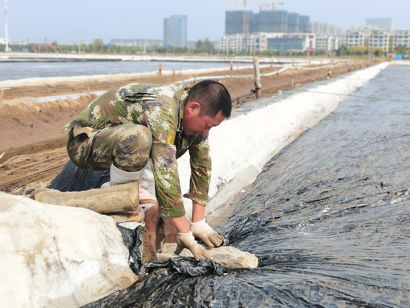 礦鹽班組根據(jù)天氣狀況做好雨前塑布苫蓋工作,確保勞動(dòng)成果不受暴雨影響,最大化實(shí)現(xiàn)年產(chǎn)量,并利用扒鹽停機(jī)間隙做好灘地基礎(chǔ)工作,維護(hù)輸鹽管道及集鹽機(jī),以便于扒鹽開機(jī)高效率運(yùn)轉(zhuǎn)。