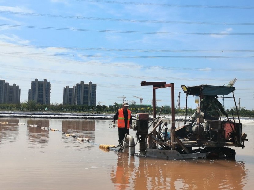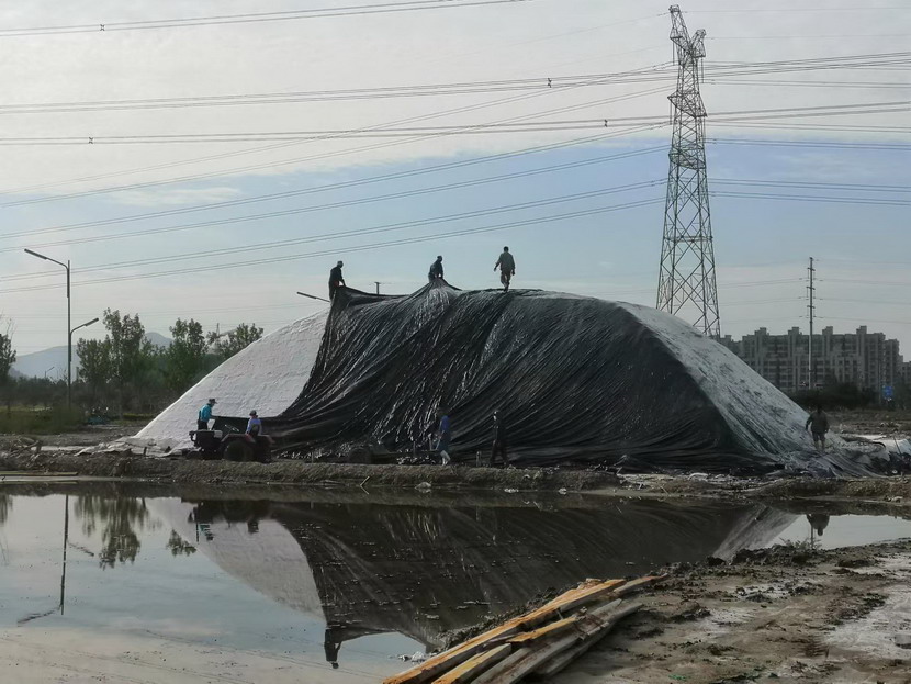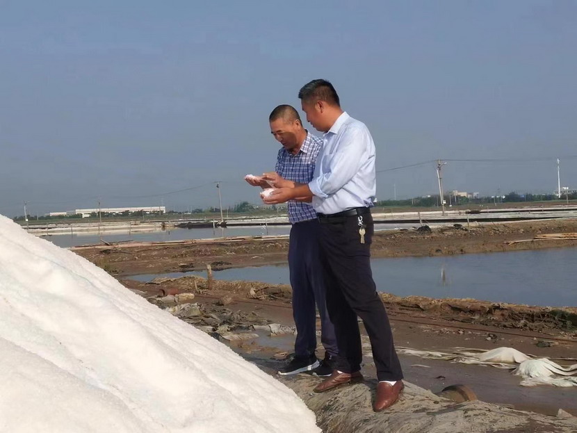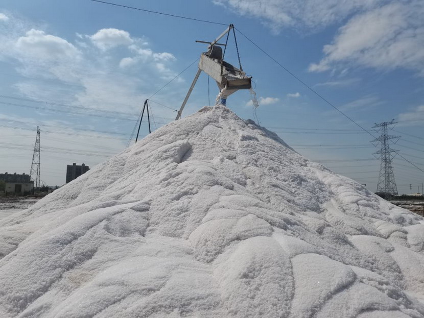 第一片180公畝的曬鹽池已經(jīng)收鹽完畢,工人師傅們嫻熟有序用塑布對鹽廩進(jìn)行覆蓋,預(yù)防雨水造成鹽斤淌化。
