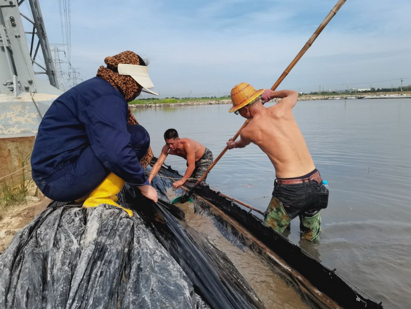回程途中,我們又經(jīng)過鈣液生產(chǎn)灘地,廣大職工在鈣液銷售旺季,趕進度、搶工期。在海濱泵站,徐松保師傅正在室外查看鈣液計量表,為鈣液車開具單據(jù)。據(jù)了解,他一天在室外要為20余輛鈣液車開單子,中午吃頓飯出出進進幾次才能吃完,衣服濕了干,干了濕,十分辛苦!在先鋒泵站,程輝師傅撩起工作服擦了擦臉上的汗水,繼續(xù)將潛水泵安置到已廢棄的灘地里,把灘地里的雨水抽干,將廢棄的灘地利用起來晾曬低濃度的鈣液,解決銷售旺季成品鈣液供不應(yīng)求難題。用廣大職工的話:天氣再熱,困難再多,也擋不住我們沖刺生產(chǎn)18萬方鈣液的腳步。