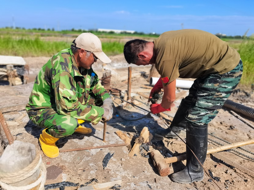 來到海州灣公司灘頭,遠遠望見幾名職工在鹽池里勞作,走近一看,組長夏軍正帶領(lǐng)一組人整修塑苫池。“我們5點就出來了,趁早涼,趕緊把塑料布整理一下,布子上都是鹵,長了鹽就不好處理了,搞不好這鹵水還會淌到外面去,造成浪費......”邊說著邊用肩膀頭子蹭一下眼角的汗水,手里的活一直沒停。據(jù)了解,海州灣公司承接臺北礦鹽和鈣液兩大產(chǎn)業(yè),經(jīng)濟比重占全公司收入60-70%,當前雖然是高溫期,但是廣大職工搶抓汛期難得的晴好天時,每天清晨5點就在灘地上忙碌起來,汗水模糊了雙眼,額頭的汗水順著帽檐往下滴落,身上的衣服一直都是濕漉漉的,緊貼在身上,即便如此,他們也毫不在意,用他們的話:“看著池子里每時每刻都在落鹽,這點汗就沒白淌啊!”我們臨走的時候,夏軍還不忘說:“今年我們保證鹽量突破2萬噸,不虧損?!?/span>