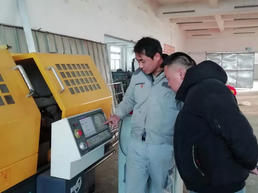 ▲2021年度星級員工-趙原塵(藍(lán)衣)指導(dǎo)新員工操作數(shù)控機床