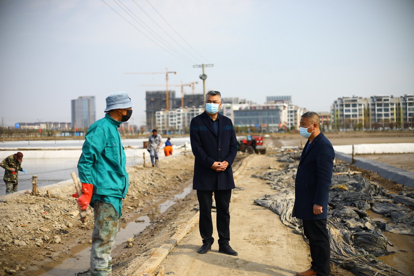 第一站來到海州灣公司昌圩班組。該班組4月1日礦鹵灌池,目前第四塊結(jié)晶池正在進鹵,該公司三大組長帶著各自隊伍都來支援,一起給新灌結(jié)晶池更換新塑苫布,大家忙的不亦樂乎。王董事長首先慰問大家,新冠疫情暴發(fā)以來,海州灣公司廣大員工克服困難,一邊強化疫情防控,一邊加班加點抓生產(chǎn),雖然有的工作耽誤了,但是礦鹵灌池工作仍然趕在天時轉(zhuǎn)好之前進行了。昨天進鹵的結(jié)晶池底已經(jīng)鋪上了一層鹽,看起來甚是喜人。昌圩班組負責人,老先進老黨員朱春年同志看到王董事長來檢查工作,他也非常高興,和海州灣公司負責人劉天義一同聚攏過來,與董事長攀談,匯報工作。最后王董事長強調(diào),一定要抓緊灌池,抓緊更換新塑苫布,打好“礦鹵復(fù)產(chǎn)”戰(zhàn),我們基礎(chǔ)產(chǎn)業(yè)牢固了,臺北的發(fā)展也就穩(wěn)固了。同時,也不要忘記抓好疫情防控工作,職工集體工作時要保持一米線距離,保證不扎堆。劉天義、朱春年代表職工表態(tài),一定按照投資公司有關(guān)布置抓好各方面工作,一定拼命干,加油干,爭當虎將打頭陣,當好“臺北保衛(wèi)戰(zhàn)”主攻隊。