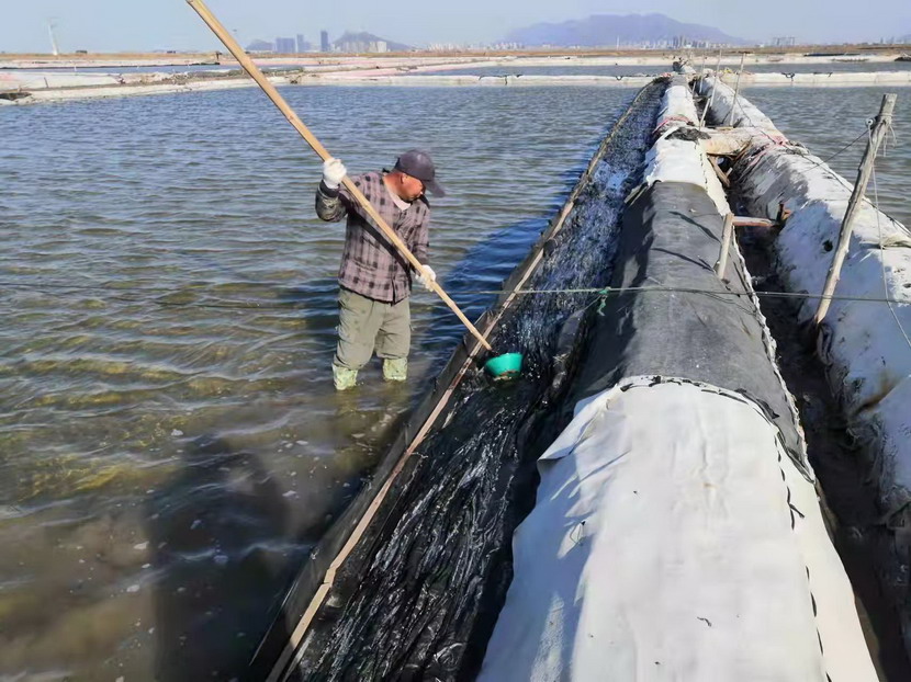 2021年,他服從公司生產(chǎn)機(jī)制的轉(zhuǎn)換,被安排到海濱三組18號灘作為領(lǐng)灘手,負(fù)責(zé)鈣液生產(chǎn)。為了不浪費每一毫米的蒸發(fā)量,每天天剛蒙蒙亮,就能看見他在縱橫阡陌的鹽田間穿梭,根據(jù)灘田結(jié)構(gòu)、針對不同季節(jié)確定走水路線,每天重復(fù)著調(diào)節(jié)鈣液、修整溝堰、修補塑布的工作,遇到大雨,他就不回家,守在灘上,及時把鈣液按照不同濃度引進(jìn)鹵臺、鹵窖,雨水結(jié)束,第一時間把灘面淡水排掉,將鈣液回引進(jìn)行晾曬。在生產(chǎn)面積僅有311畝的情況下,他每天要走3萬-4萬步,不僅對他自己的生產(chǎn)單元,對整片鈣液生產(chǎn)單元了如指掌,有多少閘門,多少電線桿,都了然于心。全年下來,生產(chǎn)鈣液28000方,在12個鈣液生產(chǎn)單元中名列前茅,領(lǐng)先超9000方,實至名歸的生產(chǎn)標(biāo)兵。