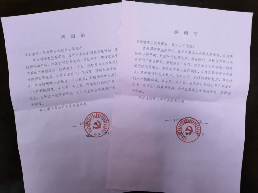 “臺北投資公司的黨員同志們視疫情防控為己任,服從調(diào)度安排,站好每一班崗,不僅認(rèn)真履行防控職責(zé),又創(chuàng)新開展疫情防控教育宣傳、便民服務(wù)等多項活動,成為我們社區(qū)防疫攻堅的主力軍?!?/span>3月25日,收到開發(fā)區(qū)猴嘴街道昌圩社區(qū)送來的一份特殊的“禮物”— 一封疫情防控感謝信,感謝臺北投資公司黨員蘇玲、孫芳等同志在新冠肺炎疫情防控的關(guān)鍵階段挺身而出、伸出援手,參與協(xié)助社區(qū)的疫情防控工作。