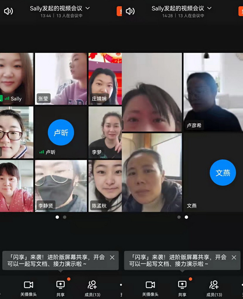 線上貢獻篇。“縱然居家隔離,一樣不防礙我們做貢獻,我們線上服務已經(jīng)開啟”三八節(jié)這一天,在社區(qū)忙碌一天的公司女工委副主任宋文靜又特意安排了“三八”節(jié)線上活動。這一天活動精彩紛呈:首先是視頻連線,通過廣大女工并向她們家人傳達市委市政府以及集團黨委、投資公司黨委關于疫情防控文件精神。其次共同學習全國“兩會”會議精神。第三,開展公司“三新”解放思想大討論線上論壇,圍繞疫情防控、生產(chǎn)經(jīng)營,尤其是企業(yè)轉型發(fā)展出謀劃策。最后還來了點小游戲-成語“飛花令”,給嚴肅的疫情防控增添了一息歡樂的氛圍。