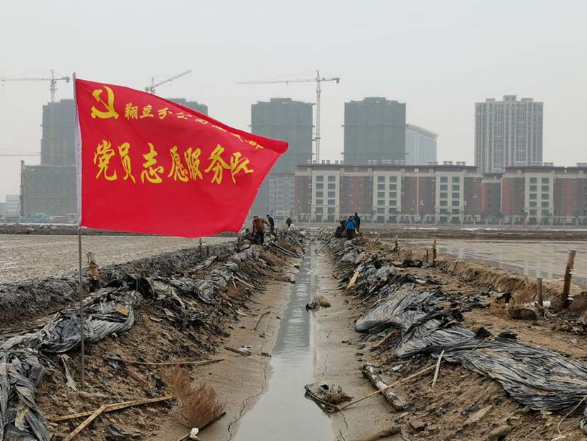 勞動現(xiàn)場,鮮紅的“黨員突擊隊”旗幟迎風(fēng)飄揚(yáng),凜冽的寒風(fēng)夾雜著細(xì)雨,絲毫不減大家的勞動熱情,個個汗流浹背、滿身泥漿,不怕臟不怕累,經(jīng)過3個小時的突擊勞動,共清理1200米、16車池埝垃圾。