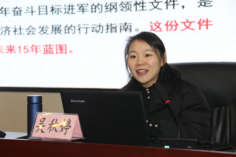 吳秋婷副主任在題為“開啟全面建設社會主義現(xiàn)代化國家新征程”報告中,從新階段與新目標、新理念與新部署、新變化與新格局等三個方面給大家解讀了黨的十九屆五中全會精神?!靶码A段與新目標”部分,介紹了我國在決勝全面建成小康社會取得的三大決定性成就,即十三五期間,全面深化改革取得重大突破;經(jīng)濟實力、科技實力、綜合國力躍上新的大臺階。在“新理念與新部署”部分,從社會發(fā)展、創(chuàng)新發(fā)展、統(tǒng)籌發(fā)展等角度分別提出了習近平總書記在新時代下對中國共產(chǎn)黨人的要求以及我國社會發(fā)展必須遵循的基本原則。在“新變化與新格局“部分,強調實現(xiàn)“十四五”規(guī)劃和2035年遠景目標意義重大、任務艱巨,但是前景光明,全黨全國各族人民要緊密團結在以習近平同志為核心的黨中央周圍,同心同德,頑強奮斗,積極響應十九屆五中全會對全黨全國人民的號召,奪取全面建設社會主義現(xiàn)代化國家的勝利。