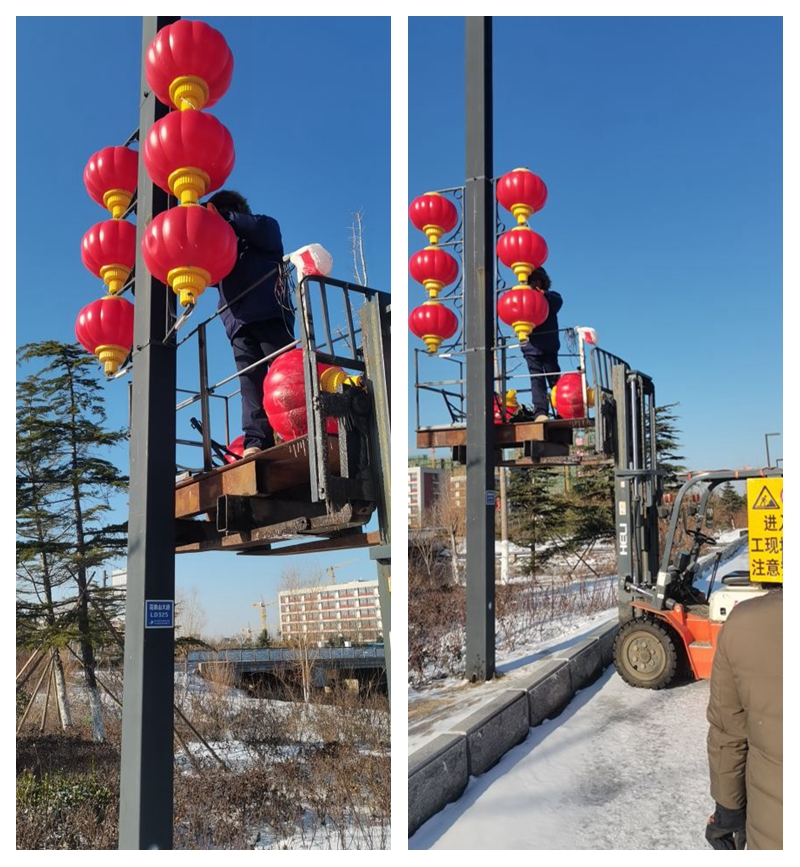 “亮華港城”。近期的一場(chǎng)大雪不僅給港城披上一件銀裝,也將花果山大道兩旁的路燈和燈籠刮落損壞。翔立鐵軍放棄休息奮戰(zhàn)在修復(fù)燈籠工程一線,保障了人民群眾的出行安全。