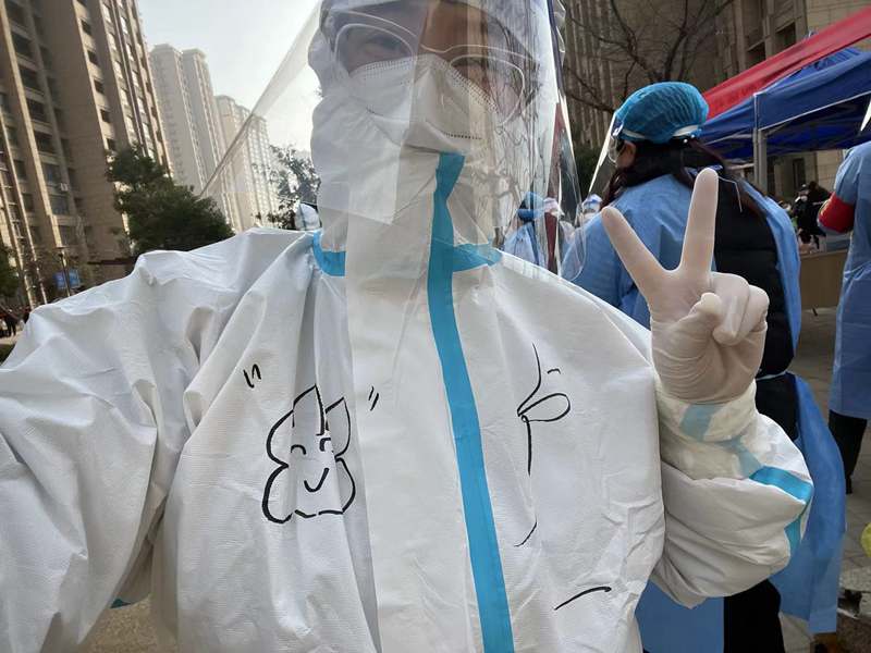 ? 3月12日,晴,8:00到達(dá)社區(qū)核酸采樣點(diǎn),準(zhǔn)備上崗,社區(qū)負(fù)責(zé)人給我們進(jìn)行了“防護(hù)服穿脫”及防疫知識(shí)的講解學(xué)習(xí)等一系列十分細(xì)致地培訓(xùn)后,有點(diǎn)興奮的穿好“大白服”,帶上手套、頭套和面罩,社區(qū)阿姨還幫我在衣服上畫(huà)上了可愛(ài)的涂鴉;
