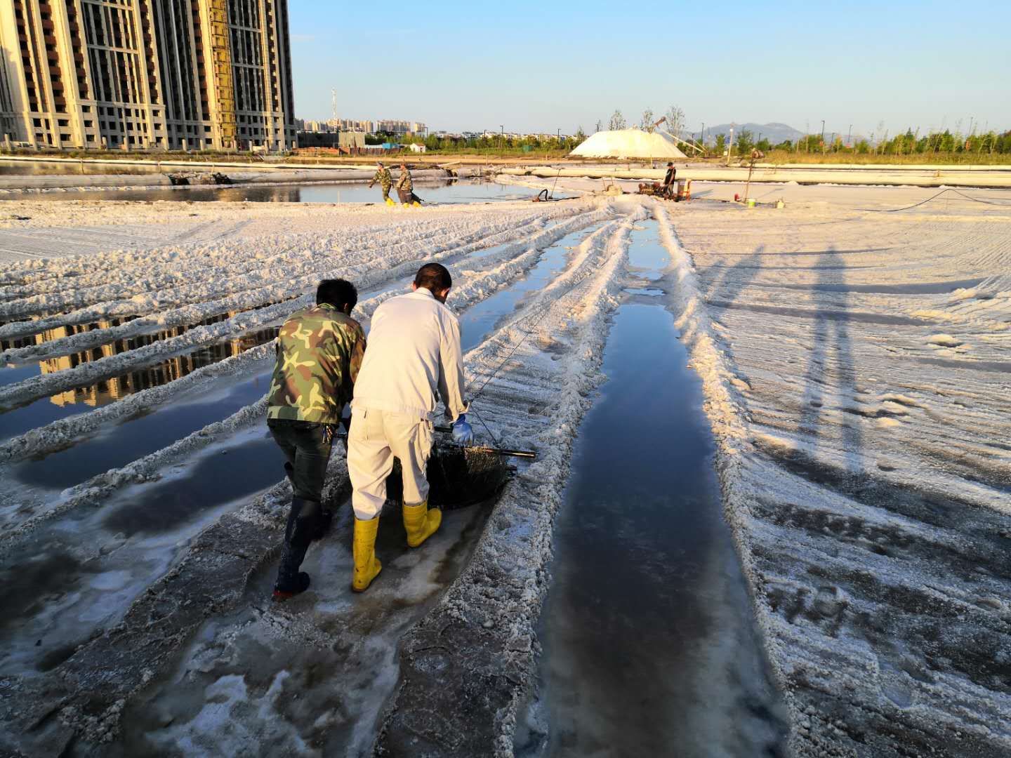 工區(qū)加大結(jié)晶工藝調(diào)整力度,塑苫布及蓋及收,不放過1毫米蒸發(fā)量,真正做到“云彩縫里奪鹽斤”。對走完鹽的廩基進行泡制,充分挖掘制鹵潛力,抓好窮制鹵。嚴把結(jié)晶灌池關、鹵水進池關、塑池管理關、結(jié)晶環(huán)境關,搶天時、抓制鹵、促工藝、結(jié)合實際加深水工,強制飽和鹵水。針對14、15班已征用灘地,在機械扒鹽后又用人工進行二次扒鹽,將塑池內(nèi)的鹽斤徹底收回,真正做到顆粒歸倉,為完成原鹽生產(chǎn)計劃盡心、盡力。