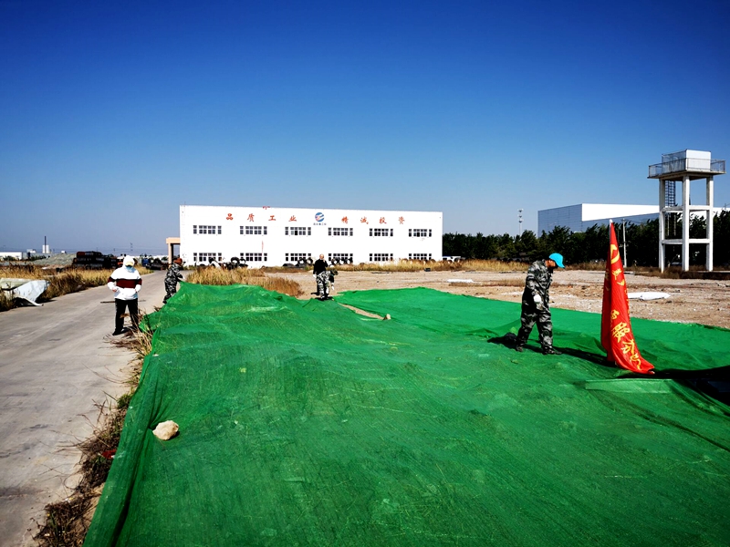 全體工作人員頂著烈日對黃土裸露區(qū)域進行覆蓋。大家分工明確,有條不紊,一邊清理廢棄垃圾,一邊小心謹慎的扯著防塵網(wǎng)布與迎面吹來的大風沙土博弈。大家不怕臟、不怕累,個個奮勇爭先。經(jīng)過半天的辛苦勞動,就完成了近萬平方的露天黃土覆蓋工作。放眼望去,一片“綠草茵茵”,看似不可能完成的任務(wù)在大家的同心協(xié)力下順利完工,自豪和喜悅油然而生。