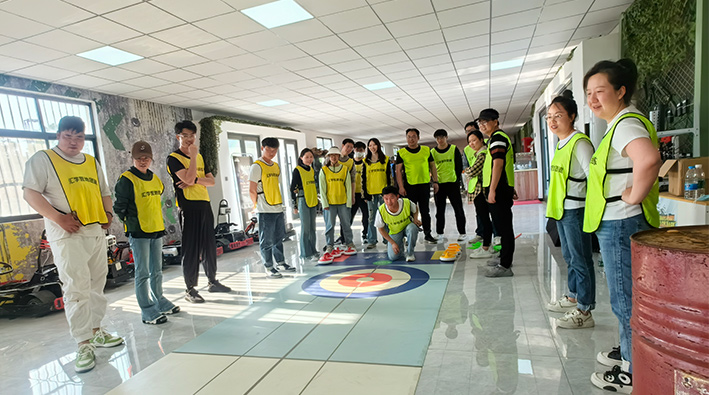 30余名青年骨干依次分成兩隊進(jìn)行團(tuán)隊拓展比賽,大家在暖場游戲破冰行動中相互熟悉。緊接著大家按照隊伍分組開展訓(xùn)練游戲,訓(xùn)練中大家集中精力,相互扶持幫助,共同完成對戰(zhàn)。其中冰壺游戲考驗(yàn)每位青年的耐心和定力,需要瞄準(zhǔn)方向,掌握好力度,共同協(xié)作得出好成績。多個極富挑戰(zhàn)性的項(xiàng)目在大家的齊心協(xié)力下順利完成。整場活動現(xiàn)場氣氛活躍,盡顯青春活力,比賽的形式也將本次活動推向了高潮。