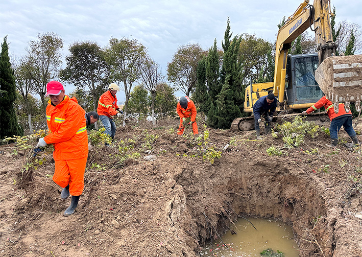 開設道口處的喬木,工人們先用高枝鋸和強力剪進行緊密精密修剪,保障后期植物根部能更好的吸收,由于挖掘機太大無法操作,只能全程人工操作,工人們干勁十足,4到5人一組,運送樹苗,挖坑、栽植、回填、覆土等步驟有條不紊地進行.并且對這些新移植的苗木和喬木進行灌水和設支撐固定架,經過一天的持續(xù)奮戰(zhàn),累計移植50余顆大小樹木。(楊雨堃)