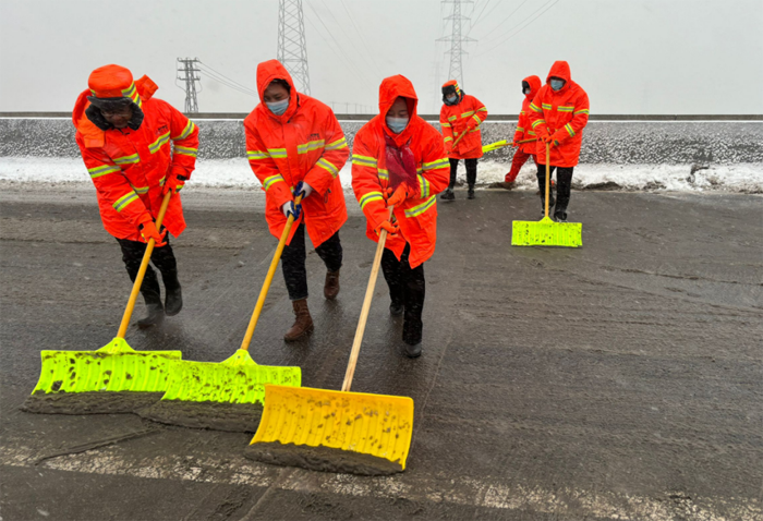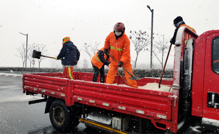 悅升公司按照責(zé)任分工,分包路段、分配任務(wù),出動(dòng)除雪機(jī)械設(shè)備,夜以繼日、奮戰(zhàn)一線,緊張有序地開(kāi)展道路冰雪清除工作。本次出動(dòng)保障人員160余名,兵分7路,2路裝卸隊(duì)負(fù)責(zé)將提前采購(gòu)好的200多噸融雪劑有序裝車(chē),5路道路保障隊(duì)負(fù)責(zé)各自區(qū)域內(nèi)的冰雪清除。保障人員克服地面濕滑、氣溫驟降等不利因素,秉承“減存遏增”的理念,各路段按照人工+機(jī)械的方式,采取“邊下雪邊除雪”的工作模式,共出動(dòng)2輛雪輥車(chē)、4輛大雪鏟車(chē)、1臺(tái)撒播機(jī)、運(yùn)雪皮卡和廂貨車(chē)共11輛,循環(huán)開(kāi)展除雪作業(yè),各組之間配合默契,大大提高了工作效率。