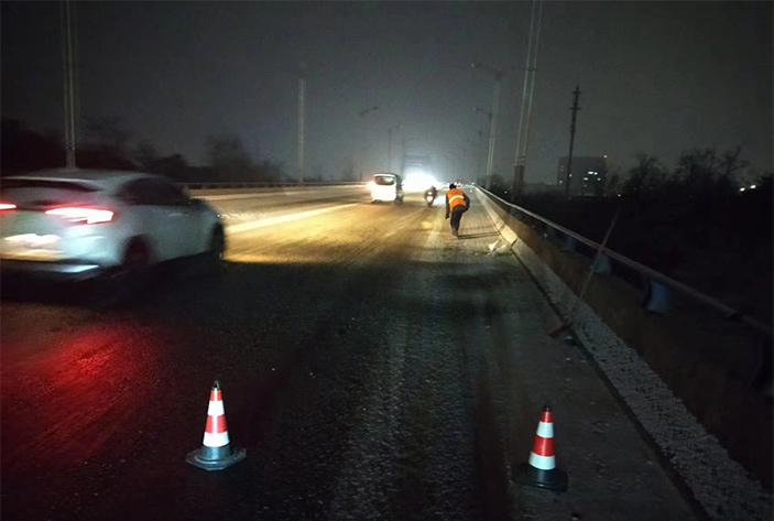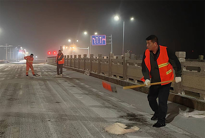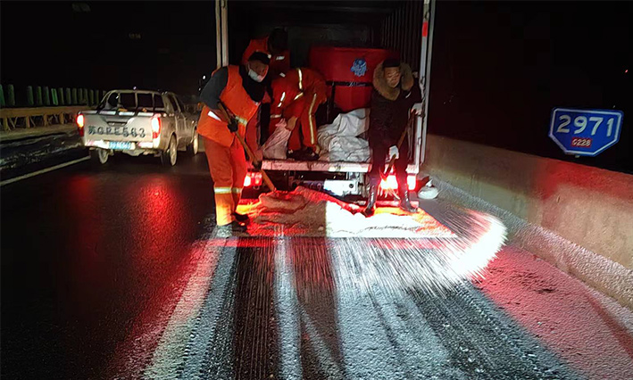 該公司除雪突擊隊由總經(jīng)理徐習(xí)華和副總王利分頭帶隊指揮,集結(jié)了安全部、管養(yǎng)部、綠化、保潔、市政、環(huán)衛(wèi)的突擊隊員80余名,出動5輛皮卡車、3輛皮卡、1臺裝載機和2輛巡查車,主要負(fù)責(zé)新區(qū)內(nèi)橋梁、連云開發(fā)區(qū)橋梁、徐新路、疏港大道、228省道等主要交通干道布撒融雪劑抗凍救災(zāi)工作。突擊隊員在進行融雪劑撒布作業(yè)的同時,及時清理路面融化雪水,防止再次結(jié)冰,各除雪設(shè)備配合作業(yè),階梯式向前推進,提高除雪效率。(李敏 王宜全)
