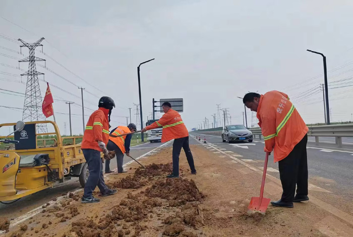 7月27日上午,臨近下班之時(shí),該分公司228省道班長(zhǎng)姚功,接到公司應(yīng)急處理電話,疏港大道向西路面近1500多米長(zhǎng),車輛拋灑嚴(yán)重影響往來(lái)車輛安全經(jīng)過(guò)。正在下班的途中他二話沒(méi)說(shuō),調(diào)轉(zhuǎn)車頭奔赴事發(fā)地點(diǎn)疏港大道,迅速擺開(kāi)安全錐,揮動(dòng)手中鐵銑開(kāi)始突擊清理路面上礦土,石塊。聞?dòng)嵉弥耸?,共產(chǎn)黨員紀(jì)樹(shù)好,胡可貴,班組成員孫洪召等同志二話沒(méi)說(shuō),一并趕往現(xiàn)場(chǎng)支援,橙色工作服在陽(yáng)光照耀下顯得格外靚麗。工作現(xiàn)場(chǎng),遇到大的石塊他們就用手搬,小的、碎的就用鐵锨和掃把清理,中午的陽(yáng)光火辣辣的,他們就這樣頂著烈日奮戰(zhàn)近兩個(gè)多小時(shí),共轉(zhuǎn)運(yùn)礦土泥塊、石子近10余車,高質(zhì)高效保障了核心道路車輛安全通行。(楊波)